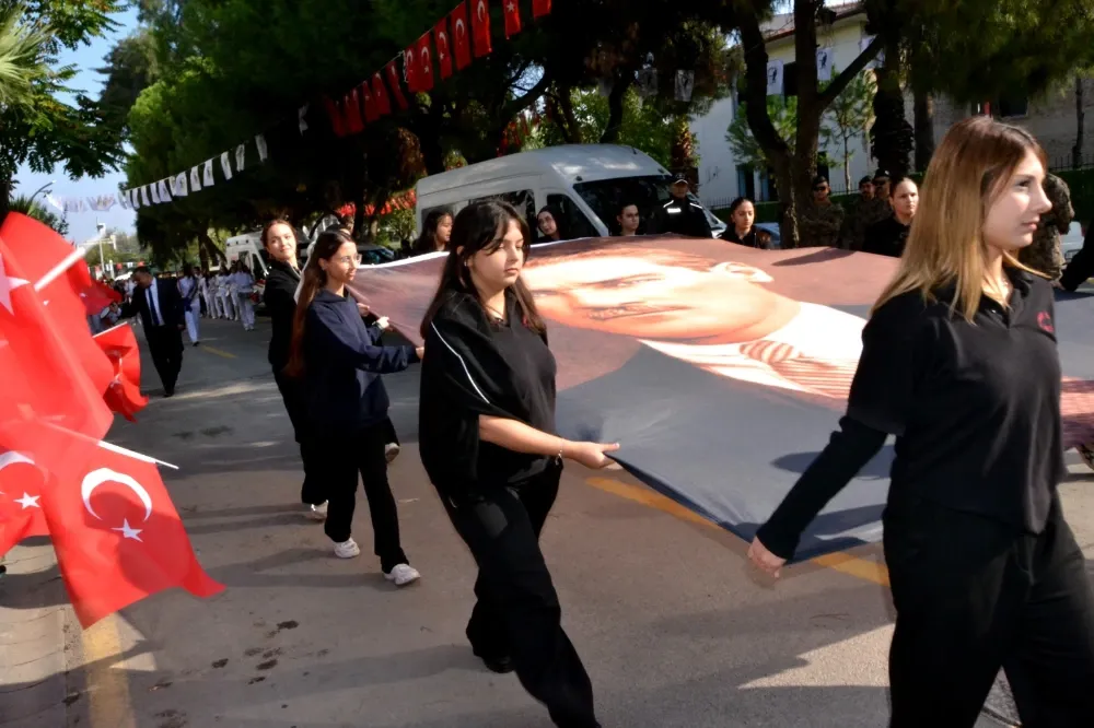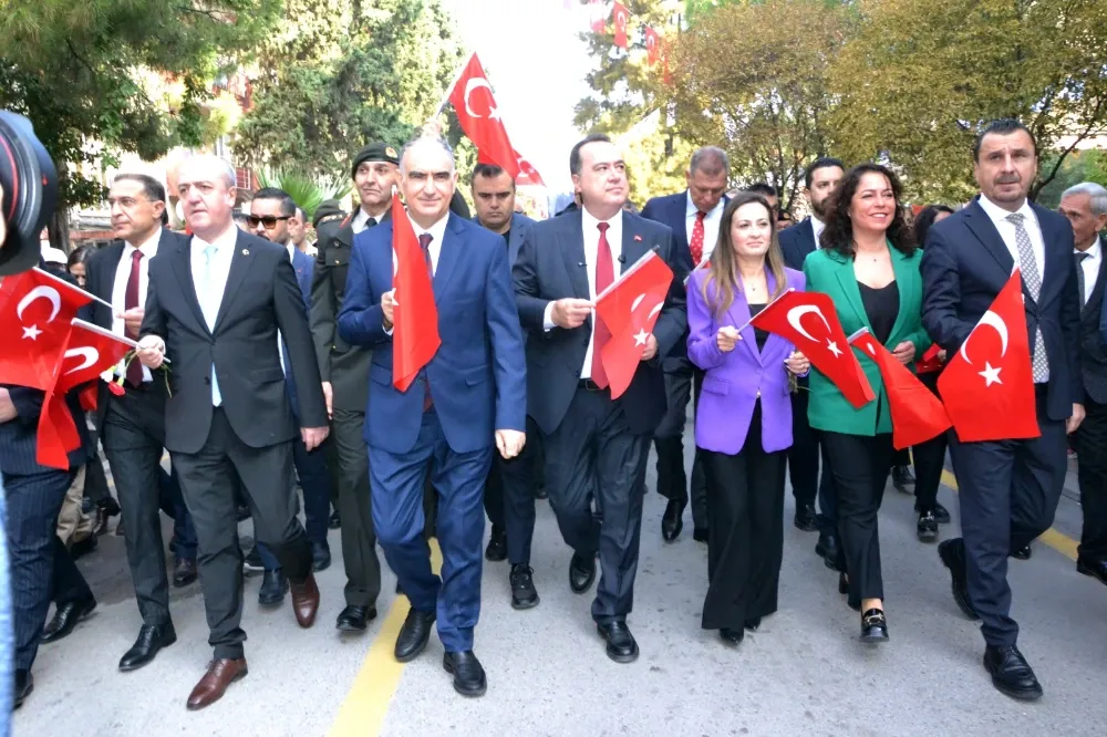 Trenden inen ve üzerlerinde Atatürk portresi taşıyan öğrenciler, Manisa Valisi Vahdettin Özkan’a Türk bayrağını takdim ederek törende duygusal bir an yaşanmasına vesile oldu. Ardından halk oyunları ekipleri sahne alarak geleneksel gösteriler sundu; Manisa Lisesi bando takımı eşliğinde protokol üyeleri ve öğrenciler Cumhuriyet Meydanı’na doğru kortej yürüyüşü gerçekleştirdi. Yürüyüşe Gazi İlkokulu ile İsmet İnönü Mesleki ve Teknik Anadolu Lisesi öğrencileri de ellerindeki Türk bayraklarıyla destek verdi; meydan boyunca oluşan birlik ve disiplin, etkinliğin en güçlü görsel unsurlarından biri oldu.