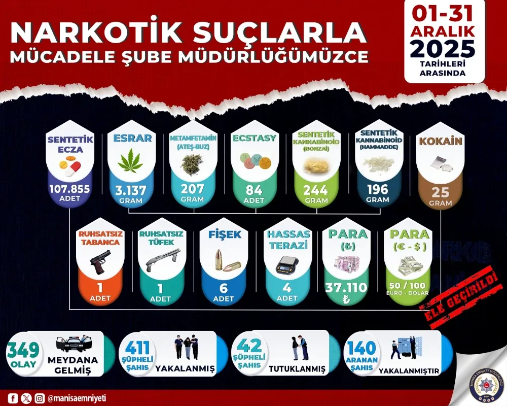 (MHA) Manisa İl Emniyet Müdürlüğü Narkotik Suçlarla Mücadele Şube Müdürlüğü, 2025 yılı Aralık ayı boyunca il genelinde uyuşturucu ile mücadele kapsamında yoğun bir çalışma yürüttü. Akhisar, Alaşehir, Salihli, Soma ve Turgutlu Narkotik Suçlarla Mücadele Büro Amirliklerinin de destek verdiği operasyonlarda, uyuşturucu madde ticareti yapan, aracılık eden, nakleden ve kullanan ya da bulunduran şahısların deşifre edilmesine yönelik çok sayıda operasyon gerçekleştirildi. 1-31 Aralık 2025 tarihleri arasında yürütülen çalışmalar kapsamında 349 olay meydana gelirken, toplam 411 şüpheli şahıs yakalandı.