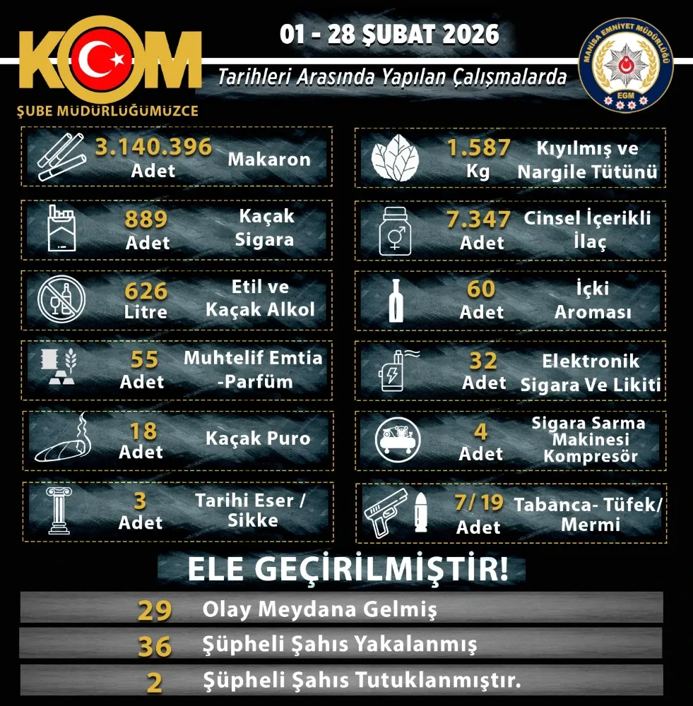 Şubat ayında Manisa genelinde düzenlenen kaçakçılık operasyonlarında 29 olay ortaya çıkarıldı, 36 şüpheli yakalandı, 2 kişi tutuklandı.