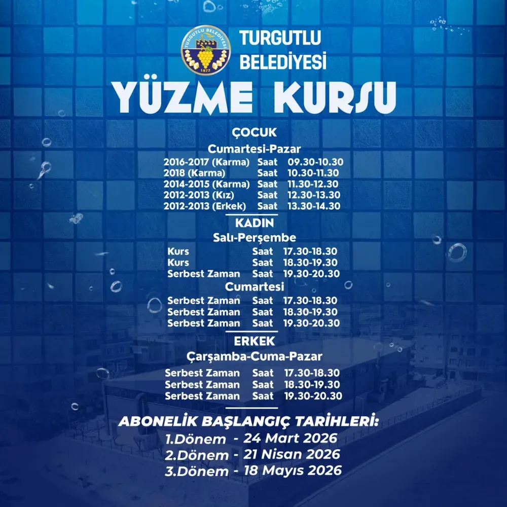 (MHA) Turgutlu Belediyesi Kültür ve Sosyal İşler Müdürlüğü bünyesinde düzenlenecek kurslarda, çocuklar ve kadınlar yüzme eğitimi alabilecek. Alanında uzman eğitmenler eşliğinde yapılacak eğitimlerde katılımcılar hem spor yapma imkânı bulacak hem de yüzme becerilerini geliştirecek.